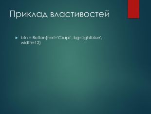 Приклад властивостейbtn = Button(text='Старт', bg='lightblue', width=12)