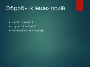 Створення кнопки (Python Tkinter)btn = Button(root, text='Натисни мене')btn.pack()