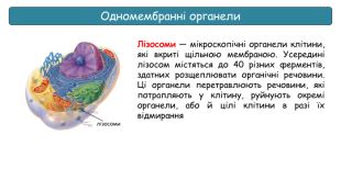 Одномембранні органели. Лізосоми — мікроскопічні органели клітини, які вкриті щільною мембраною. Усередині лізосом містяться до 40 різних ферментів, здатних розщеплювати органічні речовини. Ці органели перетравлюють речовини, які потрапляють у клітину, руйнують окремі органели, або й цілі клітини в разі їх відмирання