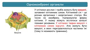 Одномембранні органели. У клітинах рослин і грибів можуть бути вакуолі, заповнені клітинним соком. Клітинний сік – це розчин органічних і неорганічних сполук. Він тисне на мембрану, підтримуючи форму клітини. У ньому можуть міститися запасні поживні речовини. У клітинах тварин вакуолі з клітинним соком відсутні. Але можуть бути вакуолі, в яких перетравлюються частинки їжі (тому їх називають травними). Вакуоля
