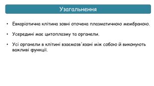 Узагальнення. Усередині має цитоплазму та органели. Евкаріотична клітина зовні оточена плазматичною мембраною. Усі органели в клітині взаємозв'язані між собою й виконують важливі функції.