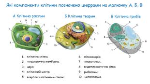 Якi компоненти клiтини позначено цифрами на малюнку А, Б, В. 1- 2- 3- 4-5-6-7-8-9-10- клітинна стінка;плазматична мембрана; ядро; вакуоля з клітинним соком;44клітинний центр;мітохондрія;хлоропласт; ендоплазматична сітка; рибосоми;цитоплазма. А Клітина рослин. Б Клітина тварин. В Клітина грибів