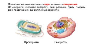 Організми, клітини яких мають ядро, називають евкаріотами. До евкаріотів належать: водорості, вищі рослини, гриби, тварини, різні представники одноклітинних евкаріотів. Прокаріоти Евкаріоти