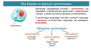 Яка будова та функції цитоплазми. Внутрішнє середовище клітини – цитоплазма. Це прозорий і в’язкий розчин органічних і неорганічних сполук, у якому містяться органели та включення Цитоплазма. У цитоплазмі розміщені постійні клітинні структури – органели та непостійні структури, які називають включення.