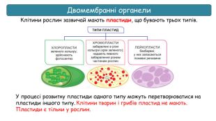 Двомембранні органели. Клітини рослин зазвичай мають пластиди, що бувають трьох типів. Клітини тварин і грибів пластид не мають. У процесі розвитку пластиди одного типу можуть перетворюватися на пластиди іншого типу. Пластиди є тільки у рослин.