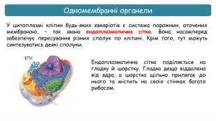 Одномембранні органели. У цитоплазмі клітин будь-яких евкаріотів є система порожнин, оточених мембраною, – так звана ендоплазматична сітка. Вона насамперед забезпечує пересування різних сполук по клітині. Крім того, тут можуть синтезуватись деякі сполуки. Ендоплазматична сітка поділяється на гладку й шорстку. Гладка дещо віддалена від ядра, а шорстка щільно прилягає до нього та містить на своїх стінках багато рибосом.