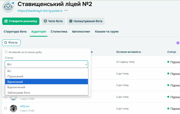 Щоб швидше аналізувати дані, що стосуються аудиторії користувачів можна застосувати фільтр та обрати статус: всі, підписаний, відписаний, відключений, заблокував бота. Я дослідив хто з користувачів має статус «Відписаний» (Додаток М) і з’ясував, що чотири користувачі відписалися. Використовуючи фільтр налаштувань, далі я побачив що два користувачі брали участь у ланцюжку опитувань та отримували розсилку. Вони поспілкувались з ботом і прочитали всі інформаційні повідомлення, після чого відписалися. Це свідчить про те, що інформацію про Ставищенський ліцей вони отримали. Інші два користувачі відразу відписалися (Додаток Н).