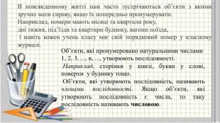 В повсякденному житті нам часто зустрічаються об’єкти з якими зручно мати справу, якщо їх попередньо пронумерувати. Наприклад, номери мають місяці та квартали року, дні тижня, під’їзди та квартири будинку, вагони поїзда, і навіть кожен учень класу має свій порядковий номер у класному журналі. Об’єкти, які пронумеровано натуральними числами 1, 2, 3, ..., n, ..., утворюють послідовності. Наприклад, сторінки у книзі, букви у слові, поверхи у будинку тощо. Об’єкти, які утворюють послідовність, називають членами послідовності. Якщо об’єкти, які утворюють послідовність є числа, то таку послідовність називають числовою.