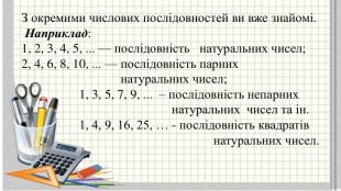 З окремими числових послідовностей ви вже знайомі. Наприклад:1, 2, 3, 4, 5, ... — послідовність натуральних чисел;2, 4, 6, 8, 10, ... — послідовність парних натуральних чисел; 1, 3, 5, 7, 9, ... – послідовність непарних натуральних чисел та ін. 1, 4, 9, 16, 25, … - послідовність квадратів натуральних чисел.