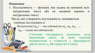 Означення: Послiдовнiсть — функцiя, яка задана на множинi всiх натуральних чисел або на множинi перших n натуральних чисел. Числа, якi утворюють послiдовнiсть, називаються членами послiдовностi. Позначення (а𝑛) — послiдовнiсть 𝑎1, 𝑎2, 𝑎3, …, 𝑎𝑛— члени послiдовностi. 2. Числова послiдовнiсть визначена, якщо визначений закон, за яким кожному натуральному n ставиться у вiдповiднiсть дiйсне число 𝑎𝑛 або заданi всi її члени.