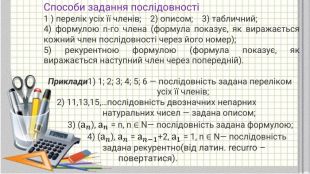 Способи задання послiдовностi1 ) перелiк усiх її членiв; 2) описом; 3) табличний;4) формулою n-го члена (формула показує, як виражається кожний член послiдовностi через його номер);5) рекурентною формулою (формула показує, як виражається наступний член через попереднiй). Приклади1) 1; 2; 3; 4; 5; 6 — послiдовнiсть задана перелiком усiх її членiв; 2) 11,13,15,…послiдовнiсть двозначних непарних натуральних чисел — задана описом; 3) (а𝑛), а𝑛 = n, n ∈ N— послiдовнiсть задана формулою; 4) (а𝑛), а𝑛 = а𝑛−1+2, а1 = 1, n ∈ N— послiдовнiсть задана рекурентно(від латин. recurro – повертатися).