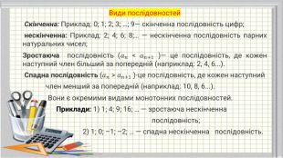 Види послідовностей Скінченна: Приклад: 0; 1; 2; 3; …; 9— скiнченна послiдовнiсть цифр; нескінченна: Приклад: 2; 4; 6; 8;… — нескiнченна послiдовнiсть парних натуральних чисел;Зростаюча послідовність (𝑎𝑛 < 𝑎𝑛+1 )— це послідовність, де кожен наступний член більший за попередній (наприклад: 2, 4, 6...). Спадна послідовність (𝑎𝑛 > 𝑎𝑛+1 )-це послідовність, де кожен наступний член менший за попередній (наприклад: 10, 8, 6...). ) Вони є окремими видами монотонних послідовностей. Приклади: 1) 1; 4; 9; 16; … — зростаюча нескiнченна послiдовнiсть; 2) 1; 0; –1; –2; … — спадна нескiнченнa послiдовнiсть.