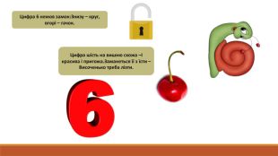 Цифра 6 немов замок: Знизу – круг, вгорі – гачок. Цифра шість на вишню схожа –І красива і пригожа. Заманеться її з їсти –Височенько треба лізти.