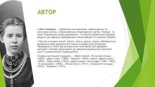Ле́ся Украї́нка (справжнє ім'я — Лари́са Петрі́вна Ко́сач, у шлюбі Ко́сач-Кві́тка; 13 (25) лютого 1871, Новоград-Волинський, Волинська губернія, Російська імперія[8] — 19 липня (1 серпня) 1913, Сурамі, Тифліська губернія, Російська імперія (нині Грузія)) — українська письменниця, перекладачка та культурна діячка, співзасновниця літературного гуртка «Плеяда» та групи Українська соціал-демократія. У сучасній українській традиції входить до переліку найвідоміших жінок давньої та сучасної України[9].