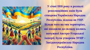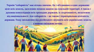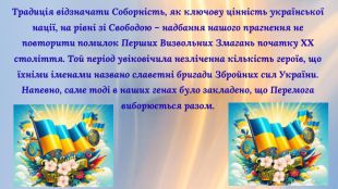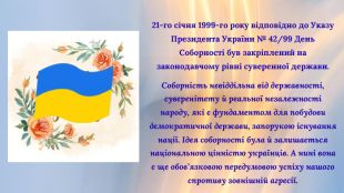 Цей день нагадує нам про важливість свободи та незалежності держави. І з кожним роком це свято набуває все більшого символізму, адже соборність — це не тільки спільна територія, це й духовна єдність, спільні ідеали, цінності та прагнення.