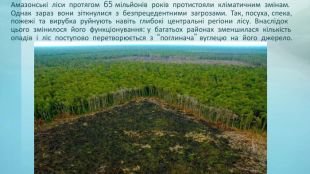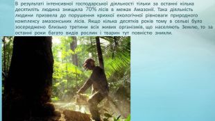 В результаті інтенсивної господарської діяльності тільки за останні кілька десятиліть людина знищила 70% лісів в межах Амазонії.