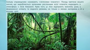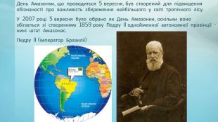 5 вересня - День тропічних лісів Амазонки. Амазонія займає територію Амазонської низовини і розташована по обидва боки екватора. В умовах вологого екваторіального клімату тут сформувалась зона вологих екваторіальних лісів, яку в Південній Америці називають сельвою, що в перекладі означає «ліс».