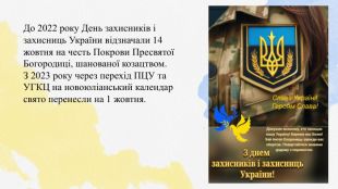 До 2022 року День захисників і захисниць України відзначали 14 жовтня на честь Покрови Пресвятої Богородиці, шанованої козацтвом. З 2023 року через перехід ПЦУ та УГКЦ на новоюліанський календар свято перенесли на 1 жовтня.
