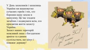 У День захисників і захисниць України ми вшановуємо сучасних героїв і тих, хто боронив нашу землю в минулому. Це час згадати загиблих і подякувати всім, хто присвятив життя захисту України. Захист наших територій можливий лише з боєздатною армією та єдиним суспільством, що цінує і поважає державу!