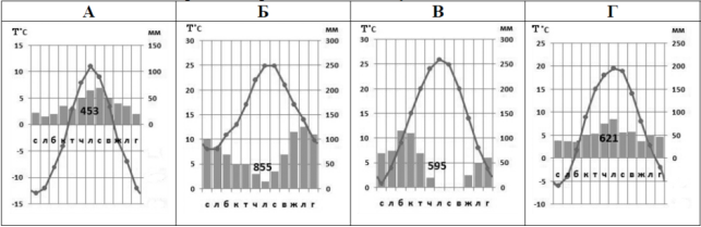 А) велика кількість опадів Б) суха погода В) влітку похолодання