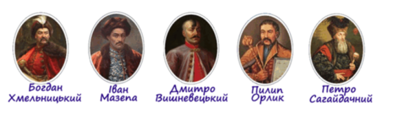 6.Місце, де зупинялися первісні люди… А) Село Б) Стоянка В) Курені 7.Обведи зображення гетьмана , який створив боєздатну армію і підписав угоду з московським царем?
