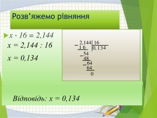 Розв’яжемо рівняннях ∙ 16 = 2,144 х = 2,144 : 16х = 0,1342,144160,11 654344864640 Відповідь: х = 0,134
