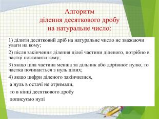 Алгоритм ділення десяткового дробу на натуральне число:1) ділити десятковий дріб на натуральне число не зважаючи уваги на кому;2) після закінчення ділення цілої частини діленого, потрібно в частці поставити кому;3) якщо ціла частина менша за дільник або дорівнює нулю, то частка починається з нуль цілих;4) якщо цифри діленого закінчилися, а нуль в остачі не отримали, то в кінці десяткового дробу дописуємо нулі