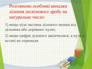 Розглянемо особливі випадки ділення десяткового дробу на натуральне число:1) якщо ціла частина діленого менша від дільника або дорівнює нулю;2) якщо цифри діленого закінчилися, а нуль в остачі не отримали
