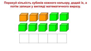 Порахуй кількість кубиків кожного кольору, додай їх, а потім запиши у вигляді математичного виразу.{5 C22544 A-7 EE6-4342-B048-85 BDC9 FD1 C3 A}{5 C22544 A-7 EE6-4342-B048-85 BDC9 FD1 C3 A}