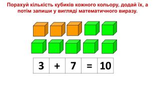 Порахуй кількість кубиків кожного кольору, додай їх, а потім запиши у вигляді математичного виразу.{5 C22544 A-7 EE6-4342-B048-85 BDC9 FD1 C3 A}3+7=10