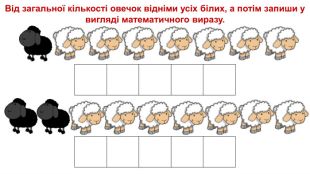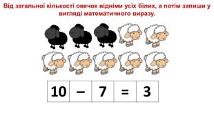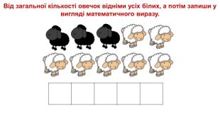 {5 C22544 A-7 EE6-4342-B048-85 BDC9 FD1 C3 A}Від загальної кількості овечок відніми усіх білих, а потім запиши у вигляді математичного виразу.{5 C22544 A-7 EE6-4342-B048-85 BDC9 FD1 C3 A}