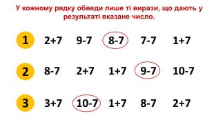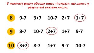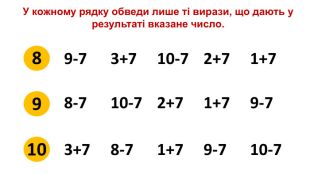 У кожному рядку обведи лише ті вирази, що дають у результаті вказане число.9-7 3+7 10-7 2+7 1+789108-7 10-7 2+7 1+7 9-73+7 8-7 1+7 9-7 10-7