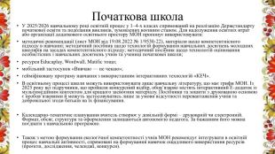 Початкова школа. У 2025/2026 навчальному році освітній процес у 1–4-х класах спрямований на реалізацію Держстандарту початкової освіти та подолання викликів, зумовлених воєнним станом. Для надолуження освітніх втрат або організації додаткового освітнього простору МОН пропонує використовувати:методичні рекомендації (лист МОН від 19.08.2022 № 1/9530-22), матеріали щодо компетентнісного підходу в навчанні; методичний посібник щодо технологій формування навчальних досягнень молодших школярів на засадах компетентнісного підходу; методичний посібник щодо технологій оцінювання особистісних і навчальних досягнень учнів та учениці початкової школи;ресурси Educaplay, Wordwall, Matific тощо;мобільний застосунок «Вивчаю — не чекаю»;гейміфіковану програму навчання з використанням інтерактивних технологій «КЕЧ». В освітньому процесі школи можуть використовувати лише навчальну літературу, що має грифи МОН. Із 2025 року всі підручники, що пройшли конкурсний відбір, обов’язково містять інтерактивний Е-додаток із мультимедійним контентом для кращого засвоєння матеріалу. Посібники та зошити з друкованою основою є необов’язковими й можуть застосовуватись лише за умови відсутності перевантаження учнів та добровільної згоди батьків на їх фінансування. Календарно-тематичне планування вчитель створює у довільній формі – друкованій чи електронній. Формат, обсяг, структура та оформлення залишаються автономією педагога. За бажанням його можна поєднати з навчальною програмою. Також з метою формування екологічної компетентності учнів МОН рекомендує інтегрувати в освітній процес навчальні активності, спрямовані на формування навичок ощадливого використання ресурсів (проєкти, дослідження, челенджі, конкурси).
