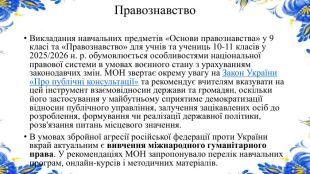 Правознавство. Викладання навчальних предметів «Основи правознавства» у 9 класі та «Правознавство» для учнів та учениць 10-11 класів у 2025/2026 н. р. обумовлюється особливостями національної правової системи в умовах воєнного стану з урахуванням законодавчих змін. МОН звертає окрему увагу на Закон України «Про публічні консультації» та рекомендує вчителям вказувати на цей інструмент взаємовідносин держави та громадян, оскільки його застосування у майбутньому сприятиме демократизації відносин публічного управління, залучення зацікавлених осіб до розроблення, формування чи реалізації державної політики, розв'язання питань місцевого значення. В умовах збройної агресії російської федерації проти України вкрай актуальним є вивчення міжнародного гуманітарного права. У рекомендаціях МОН запропонувало перелік навчальних програм, онлайн-курсів і методичних матеріалів.