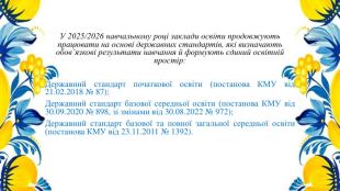 У 2025/2026 навчальному році заклади освіти продовжують працювати на основі державних стандартів, які визначають обов’язкові результати навчання й формують єдиний освітній простір: Державний стандарт початкової освіти (постанова КМУ від 21.02.2018 № 87);Державний стандарт базової середньої освіти (постанова КМУ від 30.09.2020 № 898, зі змінами від 30.08.2022 № 972);Державний стандарт базової та повної загальної середньої освіти (постанова КМУ від 23.11.2011 № 1392).