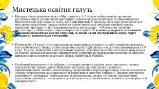 Мистецька освітня галузь. Програми інтегрованого курсу «Мистецтво» у 5–7 класах побудовані як органічне поєднання змісту різних видів мистецтва з домінантністю музичного та образотворчого. Викладати цей курс може як один, так і два вчителі. У випадку, коли курс розподіляється між двома педагогами, заклад освіти на основі модельної програми створює власну навчальну програму, у якій виокремлюються дві складові – «Мистецтво: музичне мистецтво» та «Мистецтво: образотворче мистецтво». У класному журналі для кожної складової відводяться окремі сторінки, де після назви інтегрованого курсу через двокрапку зазначається уточнення. Починаючи з 8 класу, учні переходять до опанування художніх стилів і напрямів, вивчають їхні особливості у творах різних видів мистецтва. Цей процес має логічне продовження і в 9 класі. Під час знайомства з мистецькими творами, обрання способів мистецької комунікації та творчої діяльності важливо спрямовувати учнівство на формування позитивної життєвої перспективи та створення світлого образу майбутньої України. Особливої актуальності це набуває у сучасних воєнних реаліях, коли зростають ризики психологічних травм у дітей. Важливо пам’ятати, що мистецтво є одним із найефективніших засобів самопізнання, профілактики переддепресивних станів та водночас дієвим інструментом самозарадності й формування життєвої стійкості. Завдяки потужному емоційному потенціалу твори мистецтва допомагають долати труднощі, підтримувати внутрішню рівновагу та відкривати для молодого покоління нові можливості для творчості й самореалізації.