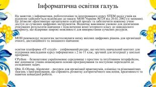 Інформатична освітня галузь. На заняттях з інформатики, робототехніки та інтегрованого курсу STEM поділ учнів на підгрупи здійснюється відповідно до наказу МОН України №128 від 20.02.2002 (зі змінами). Це дозволяє ефективніше організувати освітній процес та забезпечити кожному учню доступ до сучасних цифрових інструментів. Водночас важливою умовою для досягнення очікуваних результатів навчання є підключення комп’ютерного класу до швидкісного інтернету, що відкриває широкі можливості для використання сучасних ресурсів. МОН рекомендує педагогам застосовувати низку якісних цифрових рішень для організації очного, дистанційного та змішаного навчання:освітня платформа «ІТ-студії» – уніфікований ресурс, що містить навчальний контент для підтримки викладання курсу інформатики з 2 по 11 клас, зручний для інтеграції у шкільні програми;ЄPython – безкоштовне україномовне середовище з простим та інтуїтивним інтерфейсом, яке допомагає учням опановувати основи програмування та поступово переходити до складніших задач;Qbit, E-Olymp, Algotester – ресурси для організації практикумів, олімпіад та різноманітних змагань з програмування, що сприяють розвитку алгоритмічного мислення, креативності та навичок командної роботи.