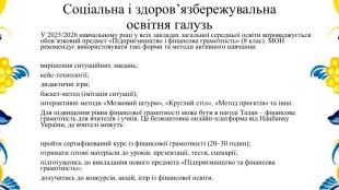 Соціальна і здоров’язбережувальна освітня галузь. У 2025/2026 навчальному році у всіх закладах загальної середньої освіти впроваджується обов’язковий предмет «Підприємництво і фінансова грамотність» (8 клас). МОН рекомендує використовувати такі форми та методи активного навчання:вирішення ситуаційних завдань;кейс-технології;дидактичні ігри;баскет-метод (імітація ситуації);інтерактивні методи «Мозковий штурм», «Круглий стіл», «Метод проєктів» та інші. Для підвищення рівня фінансової грамотності може бути в нагоді Талан – фінансова грамотність для вчителів і учнів. Це безкоштовна онлайн‑платформа від Нацбанку України, де вчителі можуть:пройти сертифікований курс із фінансової грамотності (20–30 годин);отримати готові матеріали до уроків: презентації, тести, сценарії;підготуватись до викладання нового предмета «Підприємництво та фінансова грамотність»;долучитись до конкурсів, акцій, ігор із фінансової освіти.