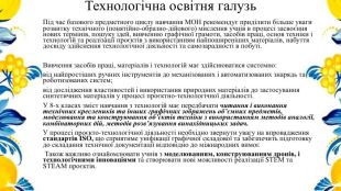 Технологічна освітня галузь. Під час базового предметного циклу навчання МОН рекомендує приділити більше уваги розвитку технічного (понятійно-образно-дійового) мислення учнів в процесі засвоєння нових термінів, пошуку ідей, вивченню графічної грамоти, засобів праці, основ техніки і технологій та реалізації проєктів з використанням найпоширеніших матеріалів, набуття досвіду здійснення технологічної діяльності та самозарадності в побуті. Вивчення засобів праці, матеріалів і технологій має здійснюватися системно:від найпростіших ручних інструментів до механізованих і автоматизованих знарядь та роботизованих систем;від дослідження властивостей і використання природних матеріалів до застосування синтетичних матеріалів у процесі проєктно-технологічної діяльності. У 8-х класах зміст навчання з технологій має передбачати читання і виконання технічних креслеників та інших графічних зображень об’ємних предметів, моделювання та конструювання об’єктів техніки з використанням методів аналогії, комбінаторних дій, методів розв’язування винахідницьких задач. У процесі проєкто-технологічної діяльності необхідно звернути увагу на впровадження стандартів ІSO, що сприятиме уніфікації графічної складової та забезпечить підготовку до складання технічної документації відповідно до міжнародних вимог. Також важливо ознайомлювати учнів з моделюванням, конструюванням дронів, і технологічними інноваціями та створювати нові можливості реалізації SТЕМ та SТЕАМ проєктів.