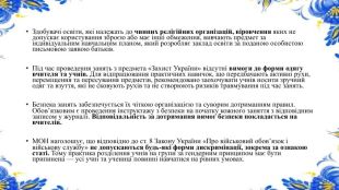 Здобувачі освіти, які належать до чинних релігійних організацій, віровчення яких не допускає користування зброєю або має інші обмеження, вивчають предмет за індивідуальним навчальним планом, який розробляє заклад освіти за поданою особистою письмовою заявою батьків. Під час проведення занять з предмета «Захист України» відсутні вимоги до форми одягу вчителя та учнів. Для відпрацювання практичних навичок, що передбачають активні рухи, переміщення та пересування предметів, рекомендовано заохочувати учнів носити зручний одяг та взуття, які не сковують рухів та не створюють ризиків травмування під час занять. Безпека занять забезпечується їх чіткою організацією та суворим дотриманням правил. Обов’язковим є проведення інструктажу з безпеки на початку кожного заняття з відповідним записом у журналі. Відповідальність за дотримання вимог безпеки покладається на вчителів. МОН наголошує, що відповідно до ст. 8 Закону України «Про військовий обов’язок і військову службу» не допускаються будь-які форми дискримінації, зокрема за ознакою статі. Тому практика розділення учнів на групи за гендерним принципом має бути припинена — усі учні та учениці повинні навчатися на рівних умовах.