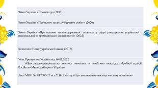 {5 C22544 A-7 EE6-4342-B048-85 BDC9 FD1 C3 A}Закон України «Про освіту» (2017)Закон України «Про повну загальну середню освіту» (2020)Закон України «Про основні засади державної політики у сфері утвердження української національної та громадянської ідентичності» (2022)Концепція Нової української школи (2016)Указ Президента України від 16.03.2022 «Про загальнонаціональну хвилину мовчання за загиблими внаслідок збройної агресії Російської Федерації проти України»Лист МОН № 1/17500-25 від 22.08.25 року «Про загальнонаціональну хвилину мовчання»