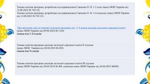 {5 C22544 A-7 EE6-4342-B048-85 BDC9 FD1 C3 A}Типова освітня програма, розроблена під керівництвом Савченко О. Я. 1-2 клас (наказ МОН України від 12.08.2022 № 743-22)Типова освітня програма, розроблена під керівництвом Савченко О. Я. 3-4 класклас (наказ МОН України від 12.08.2022 № 743-22) Про внесення змін до типової освітньої програми для 5–9 класів закладів загальної середньої освіти(наказ МОН України від 09.08.2024 № 1120)(чинна для 5–8 класів)Типова освітня програма закладів загальної середньої освіти ІІ ступеня(наказ МОН України від 20.04.2018 № 405)(чинна для 9 класів)Типова освітня програма закладів загальної середньої освіти ІІІ ступеня(наказ МОН України від 20.04.2018 № 408, оновлено наказ МОН України від 20.06.2025 №890)