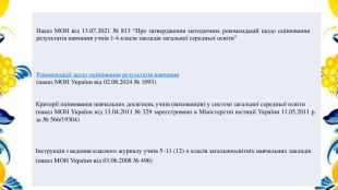 {5 C22544 A-7 EE6-4342-B048-85 BDC9 FD1 C3 A}Наказ МОН від 13.07.2021 № 813 “Про затвердження методичних рекомендацій щодо оцінювання результатів навчання учнів 1-4 класів закладів загальної середньої освіти”Рекомендації щодо оцінювання результатів навчання(наказ МОН України від 02.08.2024 № 1093)Критерії оцінювання навчальних досягнень учнів (вихованців) у системі загальної середньої освіти(наказ МОН України від 13.04.2011 № 329 зареєстровано в Міністерстві юстиції України 11.05.2011 р. за № 566/19304)Інструкція з ведення класного журналу учнів 5–11 (12)-х класів загальноосвітніх навчальних закладів (наказ МОН України від 03.06.2008 № 496)