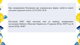 {5 C22544 A-7 EE6-4342-B048-85 BDC9 FD1 C3 A}Про затвердження Положення про індивідуальну форму здобуття повної загальної середньої освіти (12.01.2016 № 8)Постанова КМУ «Про внесення змін до порядку, затверджених постановою Кабінету Міністрів України від 15 вересня 2021р. №957 від 26 квітня 2022р. №483