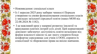 Нововведення: спеціальні класиІз 1 вересня 2025 року набирає чинності Порядок утворення та умови функціонування спеціальних класів у закладах загальної середньої освіти (наказ МОН від 22.08.2024 № 1182). І це важливий крок у напрямі розвитку інклюзії та врахування освітніх потреб усіх дітей. Цей нормативний документ забезпечує доступність освіти незалежно від форми власності школи та дає змогу створити більш комфортне середовище для учнів із ООП, сприяти їх соціалізації та збереженню права на якісне навчання.