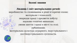 Людина і світ матеріальних речей: виробництво та споживання в різні історичні епохи; матеріали і технології; знаряддя праці і предмети побуту; науково-технічні винаходи; умови життя і праці в місті та селі; урбанізація; матеріальна культура аграрного, індустріального і постіндустріального суспільств. Базові знання