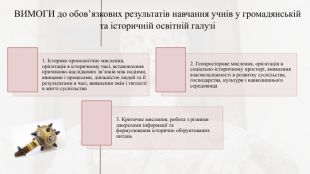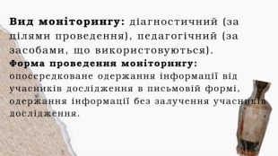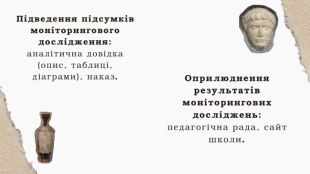 Завдання моніторингу1. Дослідження формування ключових компетентностей, якості знань учнів з історії та їх відповідність Державним стандартам базової та повної загальної середньої освіти.2. Визначення об’єктивності виставлення оцінок, відповідно до критеріїв оцінювання результатів навчання учнів з історії. 3. Виявлення та аналіз чинників, що впливають на розвиток творчого мислення, формування ключових компетентностей та рівень успішності учнів. 4. Визначення рівня професійної компетентності вчителя.5. Дослідження розвитку творчого мислення.6. Накопичення даних та аналітичне узагальнення результатів.7. Прогнозування на основі отриманих даних, вироблення пропозицій для забезпечення якісного викладання історії.