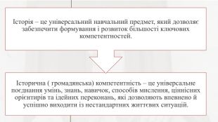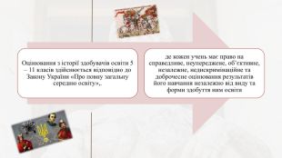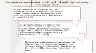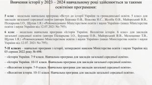 Вивчення історії у 2023 – 2024 навчальному році здійснюється за такими освітніми програмами:5 клас - модельна навчальна програма «Вступ до історії України та громадянської освіти. 5 клас» для закладів загальної середньої освіти (автори Бурлака О. В., Власова Н. С., Желіба О. В., Майорський В. В., Піскарьова І. О., Щупак І. Я.) «Рекомендовано Міністерством освіти і науки України» (наказ Міністерства освіти і науки України від 12.07.2021 No 795);6 клас – модельна навчальна програма «Історія України. Всесвітня історія. 6 клас» для закладів загальної середньої освіти (автори Піскарьова І. О., Бурлака О. В., Майорський В. В., Мелещенко Т. В., Щупак І. Я.) «Рекомендовано Міністерством освіти і науки України» (наказ Міністерства освіти і науки України від 12.07. 2021 No 795);7-11 класах – навчальні програми з історії, затверджені наказом Міністерства освіти і науки України від 03 серпня 2022 року № 698:– «Історія України. 7-9 класи. Навчальна програма для закладів загальної середньої освіти». – «Історія України. 10-11 класи. Навчальна програма для закладів загальної середньої освіти». – «Всесвітня історія. 7-9 класи. Навчальна програма для закладів загальної середньої освіти». – «Всесвітня історія. 10-11 класи. Навчальна програма для закладів загальної середньої освіти».