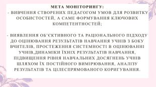 МЕТА МОНІТОРИНГУ: - ВИВЧЕННЯ СТВОРЕНИХ ПЕДАГОГОМ УМОВ ДЛЯ РОЗВИТКУ ОСОБИСТОСТЕЙ, А САМЕ ФОРМУВАННЯ КЛЮЧОВИХ КОМПЕТЕНТНОСТЕЙ; - ВИЯВЛЕННЯ ОБ’ЄКТИВНОГО ТА РАЦІОНАЛЬНОГО ПІДХОДУ ДО ОЦІНЮВАННЯ РЕЗУЛЬТАТІВ НАВЧАННЯ УЧНІВ З БОКУ ВЧИТЕЛІВ, ПРОСТЕЖЕННЯ СИСТЕМНОСТІ В ОЦІНЮВАННІ УЧНІВ,ДИНАМІКИ ЇХНІХ РЕЗУЛЬТАТІВ НАВЧАННЯ, ПІДВИЩЕННЯ РІВНЯ НАВЧАЛЬНИХ ДОСЯГНЕНЬ УЧНІВ ШЛЯХОМ ЇХ ПОСТІЙНОГО ВИМІРЮВАННЯ, АНАЛІЗУ РЕЗУЛЬТАТІВ ТА ЦІЛЕСПРЯМОВАНОГО КОРИГУВАННЯ.