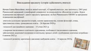 Викладання предмету історія здійснюють вчителі: Кичан Ганна Василівна, вчитель вищої категорії, «Старший вчитель», яка закінчила у 2001 році Рівненський державний гуманітарний університет за спеціальністю «Всесвітня історія». Курси підвищення кваліфікації з даного предмету проходила на базі Рівненського ОІППО за програмою підвищення кваліфікації: -вчителів суспільних предметів історія, основи правознавства, основи філософії, етика, християнська етика, громадянська освіта – 26 березня 2020 р.-технології дистанційного навчання – 15 січня 2021 р.-створення інклюзивного освітнього середовища, особливості інклюзивного навчання, забезпечення додаткової підтримки в освітньому процесі дітей з особливими освітніми потребами – 6 жовтня 2022 р.-технології розвитку критичного мислення здобувачів освіти – 14 вересня 2023р.
